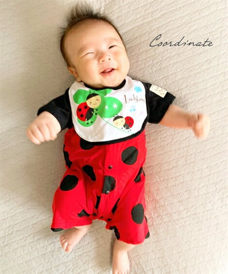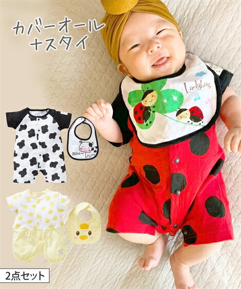 カバーオール ベビー 半袖 アニマル スタイ セット ベビー服 子供服 男の子 女の子 オフ×クリーム ひよこ /オフ×黒 うし /オフ×紺 くじら /赤×黒 てんとうむし 身長50〜60/60〜70/70〜80cm ニッセン nissen