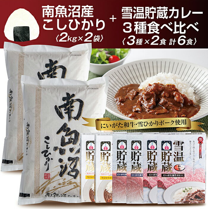 【ふるさと納税】新潟県 南魚沼産 コシヒカリ こしひかり お米 2kg ×2個 計4kg & にいがた カレー 食べ比べ セット 黒毛和牛 ポーク 豚 牛すじカレー 200g 中辛 レトルト 6食 セット 精米 魚沼 米 送料無料 炊き方ガイド付き